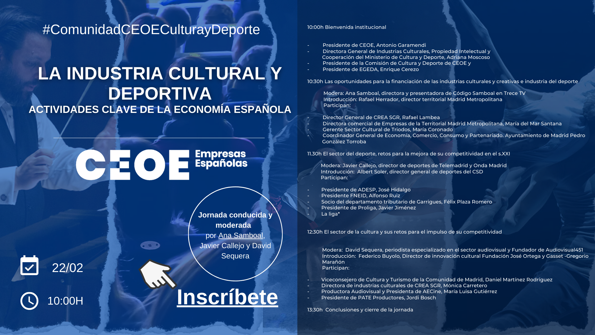 Ya están abiertas las inscripciones para participar en las Jornadas de la Industria Cultural y Deportiva que tendrán lugar el próximo 22 de febrero, de 10.00h a 13.30h en la sede de CEOE (SALA JOSE MARÍA CUEVAS).
