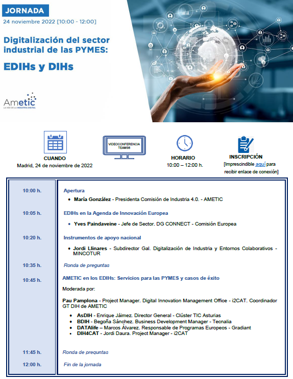 Te invitamos a este webinar, donde podrás conocer las oportunidades que presentan los DIHs, instrumentos para la digitalización de las pymes. Tendremos además la oportunidad de conocer algunos de los EDIHs seleccionados por la Comisión Europea y conocer mejor este instrumento de la mano de Yves Paindaivaine.