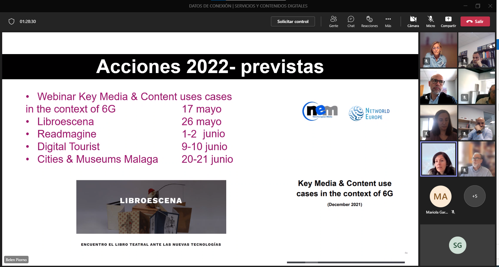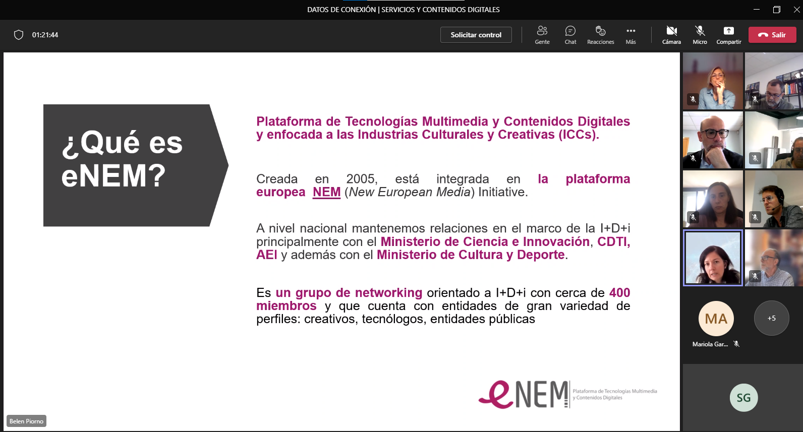 Entre ellos se encontraban representantes de Amazon, AEVI, Samsung Electronics, MediaPro, Abacanto Soluciones S.L., Soluciones Gráficas por Ordenador (SGO), Toboggan Services, Vicomtech, Bejob Santillana, Cinfo Company y Sien Consulting a quienes se se les ha presentado la plataforma de eNEM, incluyendo sus comienzos, objetivos y tipología de miembros como introducción, además de los resultados y acciones del año pasado y futuras acciones previstas para este 2022, destacando el informe de oportunidades a la financiación de las ICCs así como los documentos de posicionamiento sobre Realidad Extendida e IA aplicada a las ICCs. Con esta acción, se pretende captar nuevos miembros para la red invitándolos a inscribirse para estar al tanto de todo.