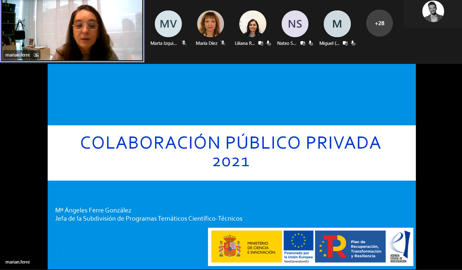 Posteriormente, María Ángeles explicó los programas de apoyo a la I+D+i, centrándose en la próxima convocatoria público-privada 2021, que están destinadas a financiar proyectos de desarrollo experimental en colaboración entre empresas y organismos de investigación. Se prevé que la convocatoria se abra en diciembre haciendo un llamamiento a los asistentes a ir preparando ideas de proyecto e incidiendo en las fórmulas de subvención o préstamo, según la tipología de la entidad. Como modelo,  puede servirnos la convocatoria Retos de 2019 ya que la memoria es parecida. Insistir en que es una convocatoria de TRLs bajos.