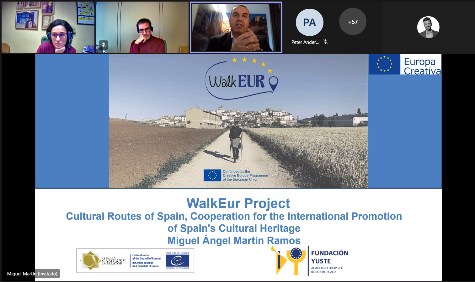 La primera mesa de esta jornada centrada en los Programas europeos para el apoyo de las ICCs fue moderada por María Azcona, Órgano de Coordinación de la Oficina Europa Creativa España de la Subdirección General de Cooperación Cultural con las Comunidades Autónomas del Ministerio de Cultura y Deporte, también participó Augusto Paramio, Coordinador de la Oficina Creativa-Cultura de la Subdirección General de Cooperación Cultural con las Comunidades Autónomas del Ministerio de Cultura y Deporte, Peter Andermatt, Director General de la Fundación Cultural Oficina MEDIA España, y Miguel Ángel Martín, Delegado de la Fundación Yuste en Bruselas, y Presidente de la Red de Cooperación de las Rutas del Emperador Carlos V – Ruta Cultural del Consejo de Europa. María Azcona explicó el programa de impulso y fortalecimiento de la cultura y creatividad Europa Creativa  para el periodo 2021 -2027 y sus subprogramas, Cultura y Media. ésta última para el cine y el audiovisual y la primera para el resto de sectores (patrimonio, moda…).