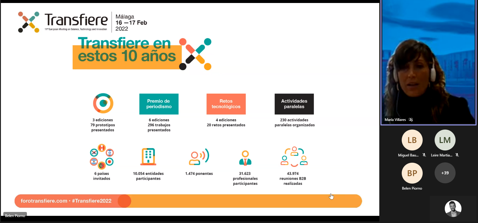 Para finalizar la jornada, María Villares, Responsable de ferias de FYCMA, explicó brevemente qué es el foro Transfiere -evento con una trayectoria de más de 10 años ubicado en Málaga- y nos invitó a todos los participantes a asistir s su próxima edición TRANSFIERE 2022,   punto de encuentro de las plataformas tecnológicas y la innovación.
