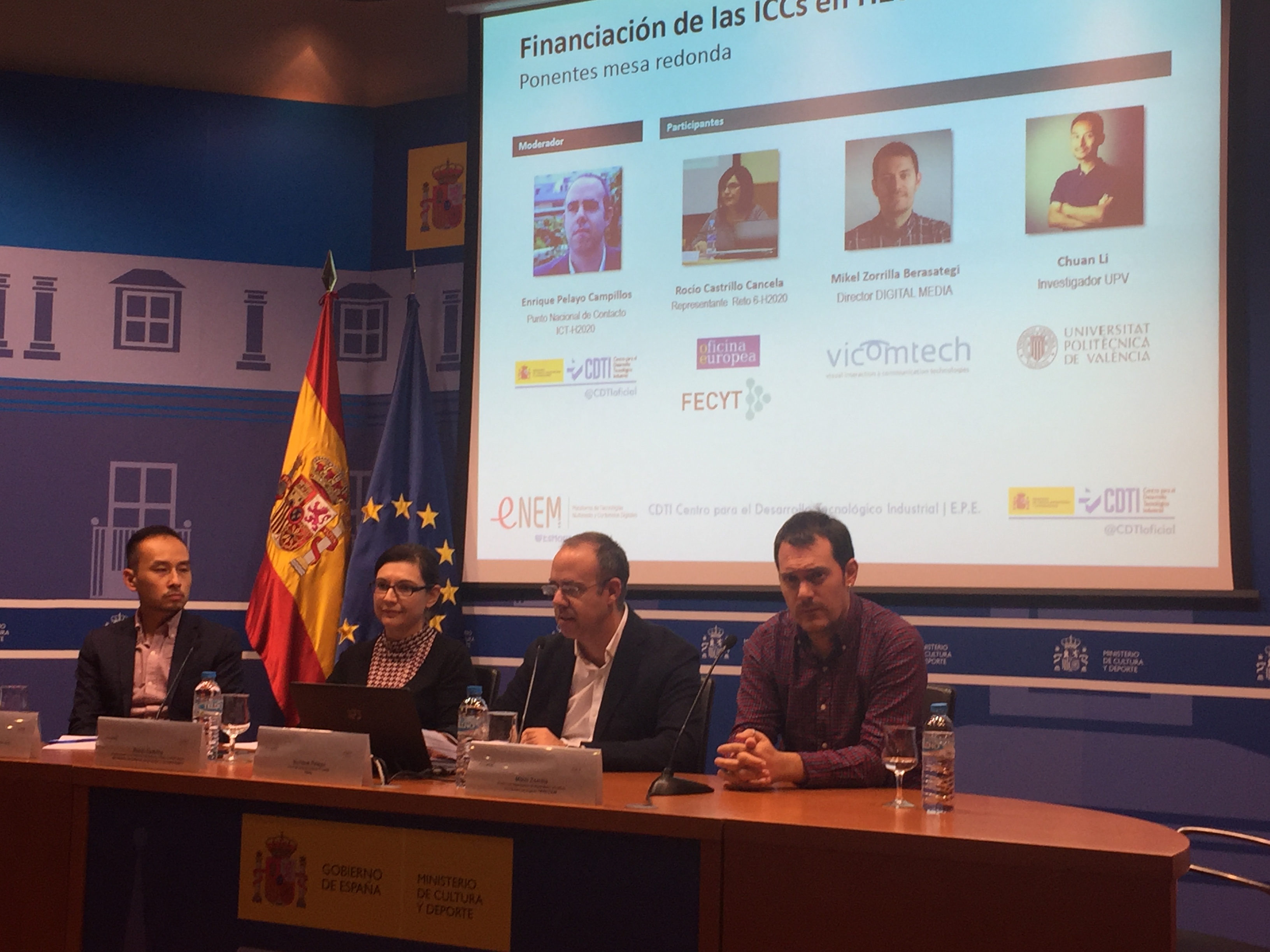 Tras la pausa café, Enrique Pelayo, Punto Nacional de Contacto de ICT H2020 de CDTI hizo una presentación global de Horizonte 2020 indicando que las oportunidades en ICCs recaen en ICT y sociedades inclusivas (Reto 6) para a continuación, explicar las próximas, es decir: ICT 44-2020 (Next Generation Media) e ICT 55-2020 (Interactive Technologies). Rocío Castrillo, representante y Punto Nacional de Contacto de Reto 6 y SwafS, explicó las tres líneas principales: Governance, Migrations y Transformations incidiendo en las calls más orientadas a patrimonio cultural. Además, invitó a los presentes, a participar en la jornada informativa que organizan el 29 de octubre en Madrid, con el fin de hablar con mayor profundidad de las oportunidades que hay y cómo orientar las ideas de proyecto. Además, habrá más jornadas informativas en noviembre en Murcia y Barcelona. Como casos de éxito, pudimos conocer Traction un proyecto europeo de Transformations que comenzará en enero 2020, coordinado por Mikel Zorrilla de Vicomtech en colaboración con el Liceu y la opera nacional de Irlanda, entre otras. Se trata de un proyecto en que se promueve la co-creación de representaciones de opera con el fin de provocar una transformación en las comunidades empoderándolas, enfocándose en núcleos de población diversos y haciendo llegar la ópera a zonas de difícil acceso a través de una Opera Digital. Por último Chuan Li, investigador-doctor en la Universidad Valencia, presentó Econcult, el Área de Investigación en Economía de la Cultura y Turismo y su experiencia gestionando distintos proyectos europeos desde los últimos 20 años. En la sesión presentó MESOC (Measuring the Social Dimension of Culture) del programa de Transformations es una Acción de Investigación e Innovación (RIA) para una nueva perspectiva y metodología con el fin de medir la dimensión social de la cultura enfocada a la salud, renovación urbana y a la participación ciudadana. Además, también indicó que en el proyecto Designscapes tienen una convocatoria abierta para la búsqueda de iniciativas innovadoras basadas en Design Thinking y en Co-Creación.