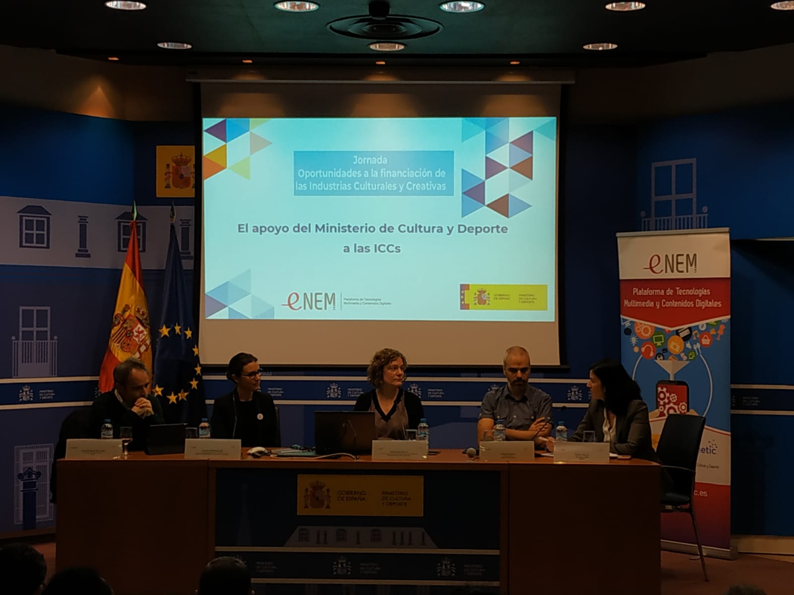 La primera mesa fue moderada por Belén Piorno, secretaría técnica de eNEM. Por orden de intervenciones, Helena del Barrio, jefa de servicio de la SG de Promoción de Industrias Culturales y Mecenazgo, compartió información sobre las convocatorias de ayudas a la modernización e innovación de las ICCs, así como las ayudas a la acción y promoción cultural convocatorias de apoyo tanto a empresas como a entidades sin ánimo de lucro que suelen publicarse en el primer semestre del año. A continuación, Carolina Rodríguez, responsable de promoción de ENISA, entidad adscrita a MINCOTUR y con clara vocación de apoyo a la pyme, explicó los préstamos participativos y los distintos tipos de líneas que ofrecen a jóvenes emprendedores, emprendedores y para el crecimiento del negocio. También compartió algunos consejos de cara a tramitar las solicitudes, ya que los plazos de evaluación pueden ser cortos con múltiples operaciones que analizar. Como casos de éxito contamos con la intervención de Daniel García, director creativo de Voilà Producciones -beneficiario de las ayudas del ministerio- compartiendo con nosotros el proyecto transmedia Invisibles así como su experiencia de internacionalización en China del proyecto A la Luna. Por su parte, José Antonio de Luna co-fundador de Filmin, plataforma pionera en vídeo bajo demanda explicó las diferentes fases y apoyos a los que se habían acogido y cómo habían impulsado adicionalmente Atlantida Film Fest, el mayor festival de cine online.